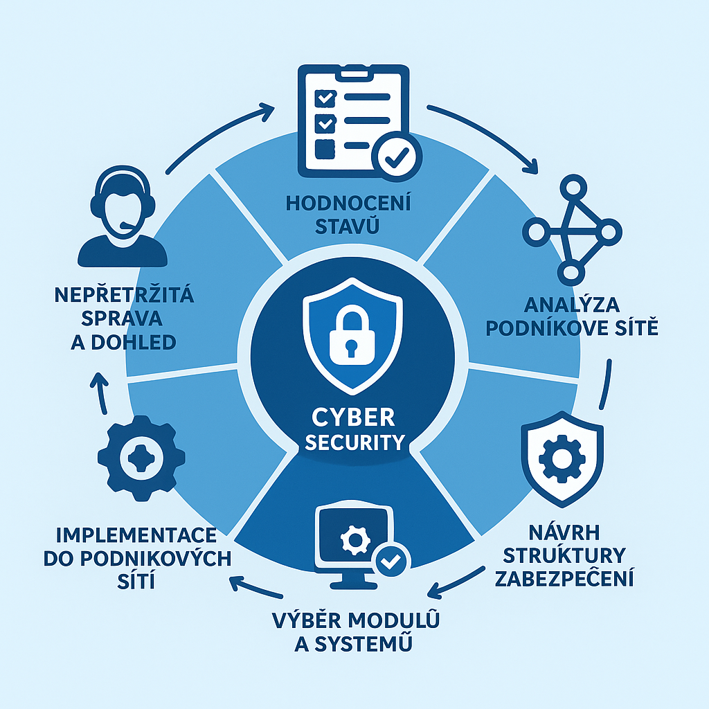 Koncept integrace a implementace bezpečnostních modulů je následující, naši konzultanti projdou s klientem informační středisko a potřeby a návazně na to nastaví řešení naší partnerské firmy Icy Bear Czech Republic s.r.o.. Jedná se sofistikované kybernetické zabezpečení, a to jak vnitropodnikových sítí, systémů tak komplexní podnikové, informační infrastruktury.